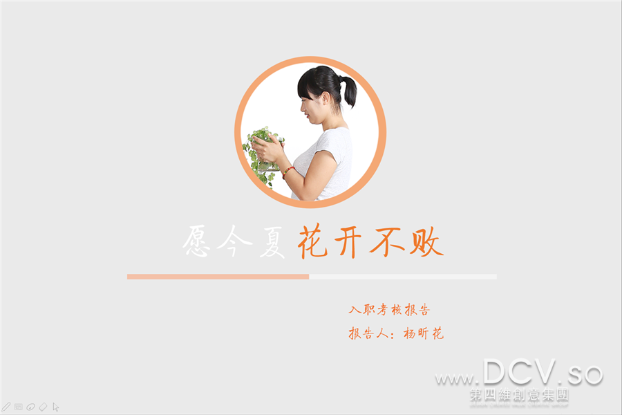 下午4点10分,DCV创意集团会议开始了,由品牌传媒总监-杨洋主持会议。进行考核报告的分别是品牌部的设计师张莹、杨天祺、杨昕花。三位设计师以“Hi,I am coming”、“总结.规划”、“愿今夏花开不败”为主题,总结个人工作内容、收获,并对未来工作做出计划。