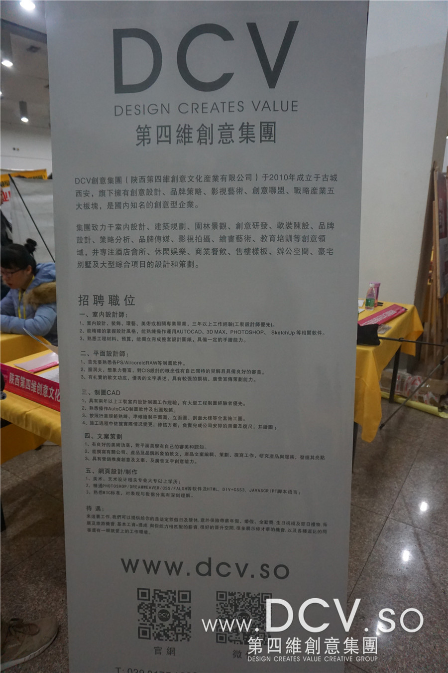 DCV创意集团在本次洽谈会上主要招聘室内设计师,平面设计师,文案策划以及网页设计和制作等方面的优秀人才!