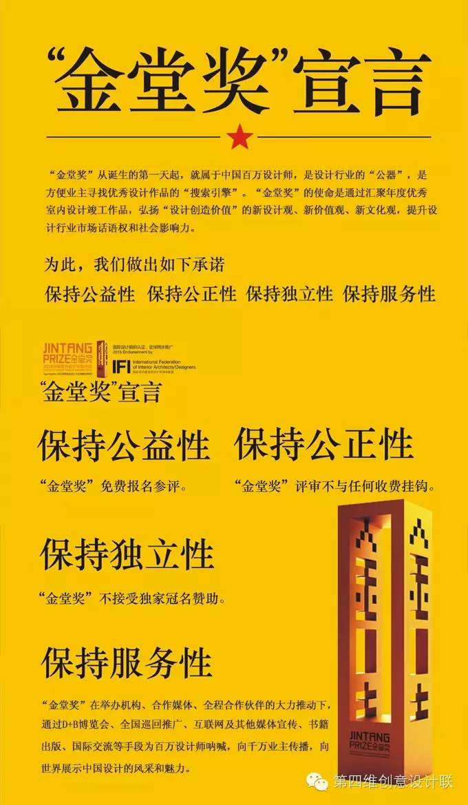 金堂奖由广州国际设计周、中国建筑与室内设计师网于2010年联合发起,国际室内建筑师/设计师团体联盟(IFI)认证,以“设计创造价值”为评审主题,以“为百万设计师呐喊、向千万业主传播”为使命,以“空间眷恋指数”为作品评审标准,通过IFI背书全球同步推广、全国近四十余个城市千人团队联合推动,建立了全球巡回活动推广、展览、互联网、报刊、出版物、影像六大传播体系,成就设计师行业话语权公器,打造业主检索年度优秀竣工设计作品的快捷引擎。
