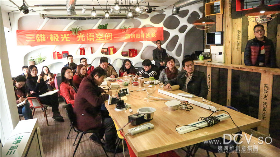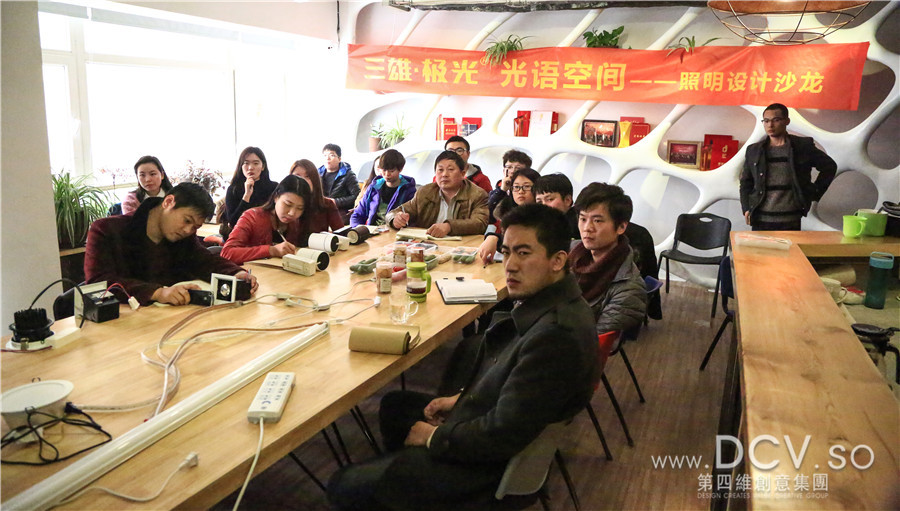 2016年1月16日下午,三雄·极光市务推广中心应用推广组权大飞组长、高级照明设计师何星海携团队走进DCV创意集团,为空间部全体设计师带来“光语空间照明设计沙龙”干货培训课程。DCV创意集团空间部全体设计师参加课程学习。