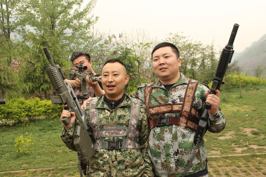 稍作休整便开始第一个项目:真人cs野战,穿上军装不论男生女生突然变得精神抖擞干练了许多。扛上属于自己的枪顿时感觉既威武又帅气。