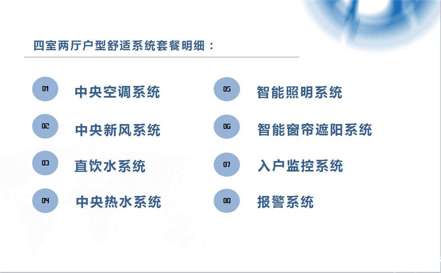 域见”通过这几个月的发展和市场调研,针对四室两厅常住人口五人内的户型进行研究,定制了一套专业的“惠民套餐”,这也是一款针对大众普通家庭的套餐,其中包含了八大系统,分别有1、日立中央空调的市场定位-“城市建设的参与者”。2、中央新风系对传统解决空气质量问题的方式进分析。3、直饮水系统4、中央热水系统5、智能照明系统6、智能窗帘遮阳系统7、入户监控系统8、报警系统8个方面的布局安装进行了讲解。详情内容可浏览如下ppt内容。