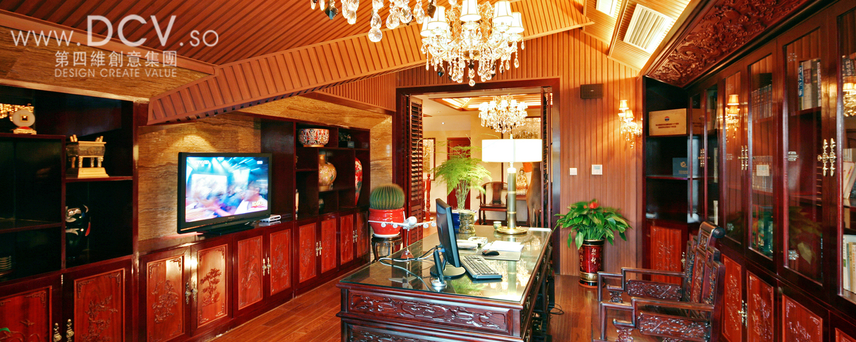 红樱桃的色彩特别能烘托中国传统红色的氛围,顶面红樱桃顶角线的运用与地面柜体上下呼应,形成统一的整体。同时异型的吊顶也是这次设计的一个特色,就像是斗拱的一种抽象,一种简单的元素符号。