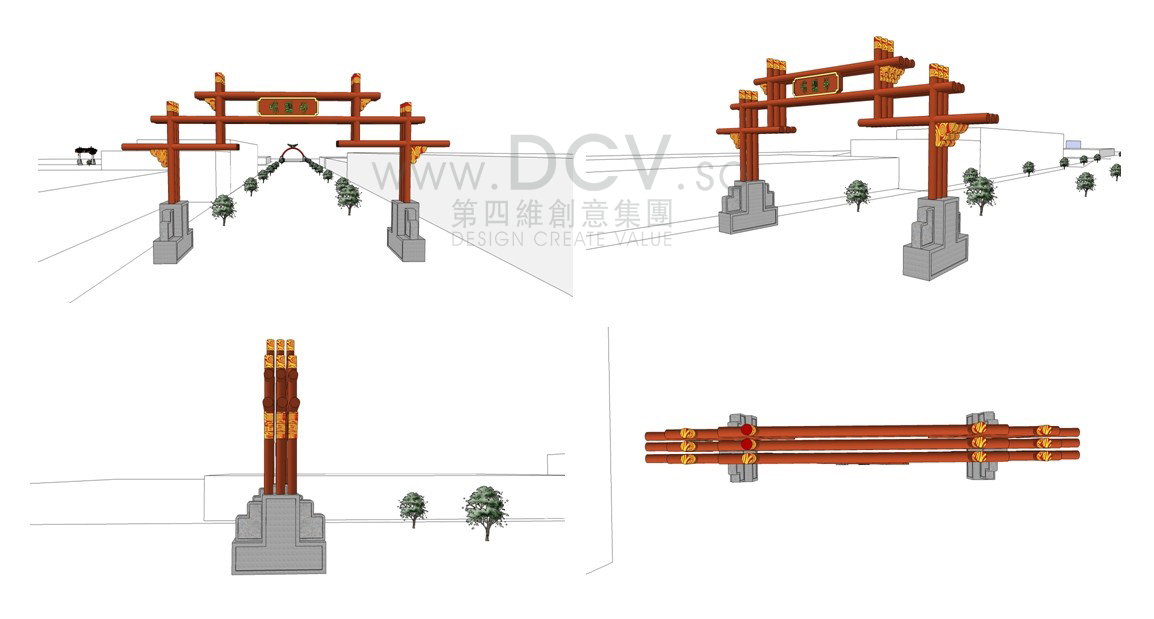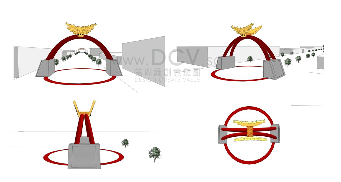 本案设计意在能够更多反映出黄金海岸市与亚太地区之间的关系,在设计中牌坊必须让从所有入口处进入中国城园区的每一位访客都有一种“到达”的感觉。在风格方面牌坊清晰表明是进入中国城园区的传统闸门,但闸门的诠释应反映我们当今与亚太地区的关系。三个独特的牌坊将代表不同城市,但又明显是互相关联,看上去像同一家庭的成员。