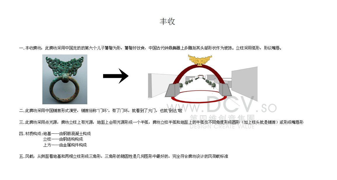 丰收牌坊:设计元素提取中国龙的的第六个儿子饕餮为形,饕餮好饮食,中国古代钟鼎彝器上多雕刻其头部形状作为装饰,立柱采用弧形,形似嘴唇。上方是一个放大的金色饕餮图纹,下方结构是一个大嘴巴我们将元素和结构有机的统一,设计之初我们就在构想怎样将饕餮吞而不泻这一特性表达出来,所以不管是在牌坊结构上还是地面的特效上都用到嘴巴。所以你不管是在正面看还是侧面看都是一个嘴巴,饕餮吞而不泻寓意丰收更是招财金宝的神兽。象征着中澳友谊长久。