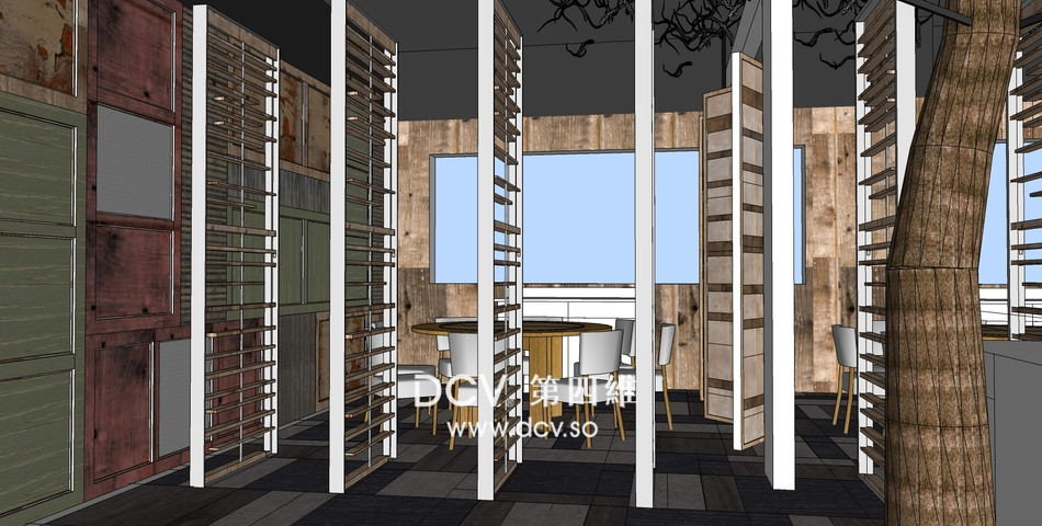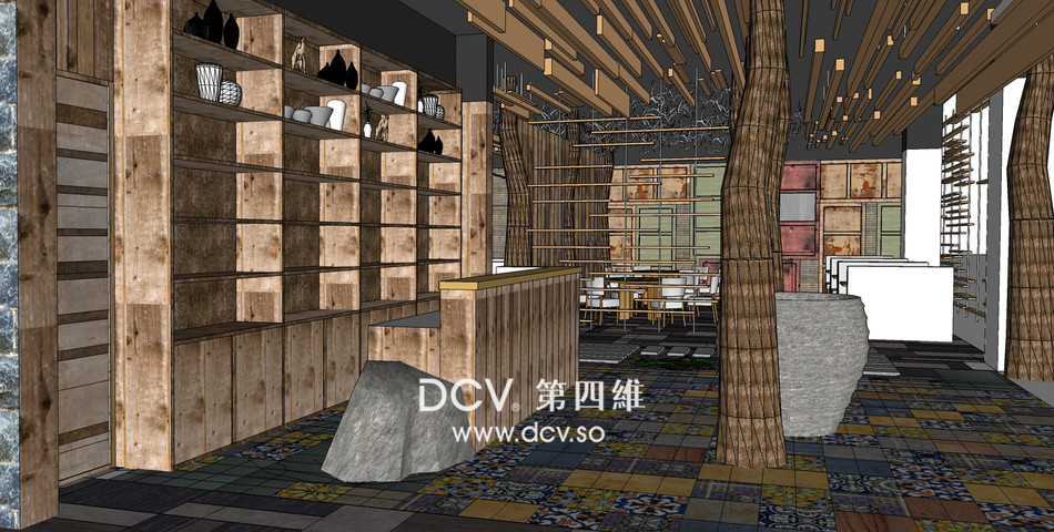 主要材料:老木头、老门板、树枝、真石漆、茶镜、600*600仿古地砖、乳胶漆。