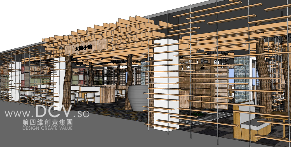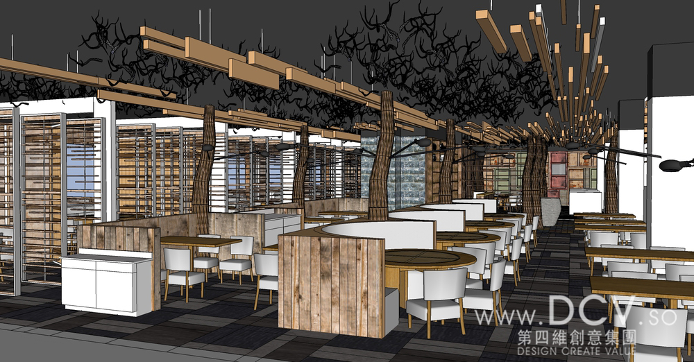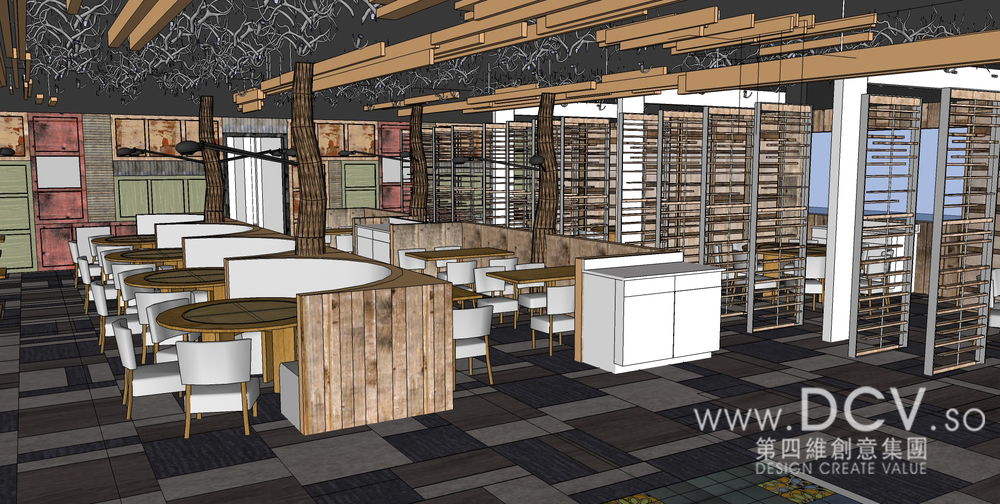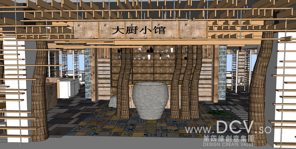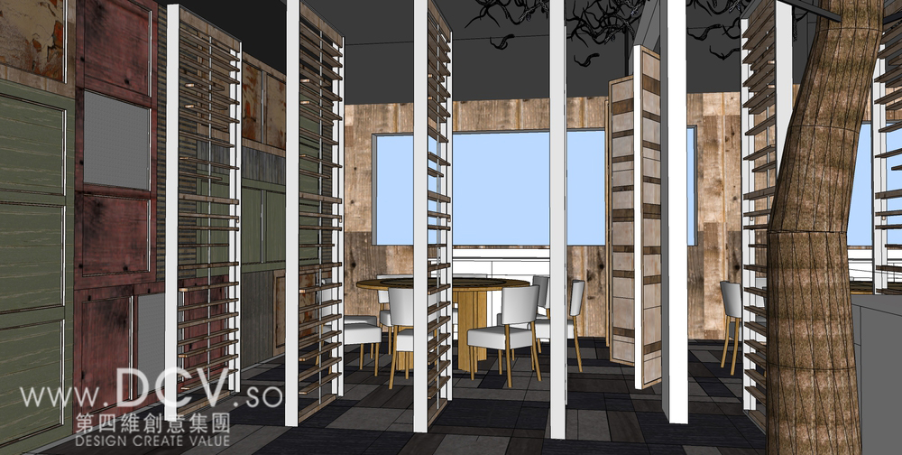 主要材料:老木头、老门板、树枝、真石漆、茶镜、600*600仿古地砖、乳胶漆。