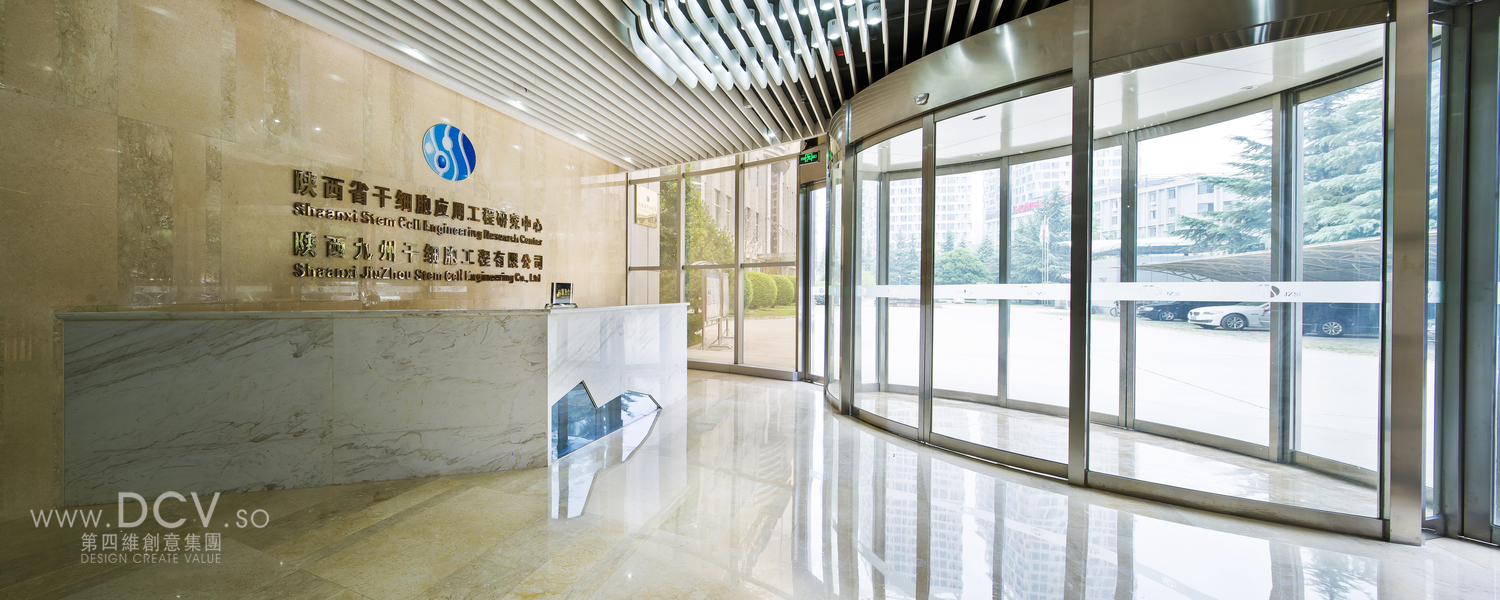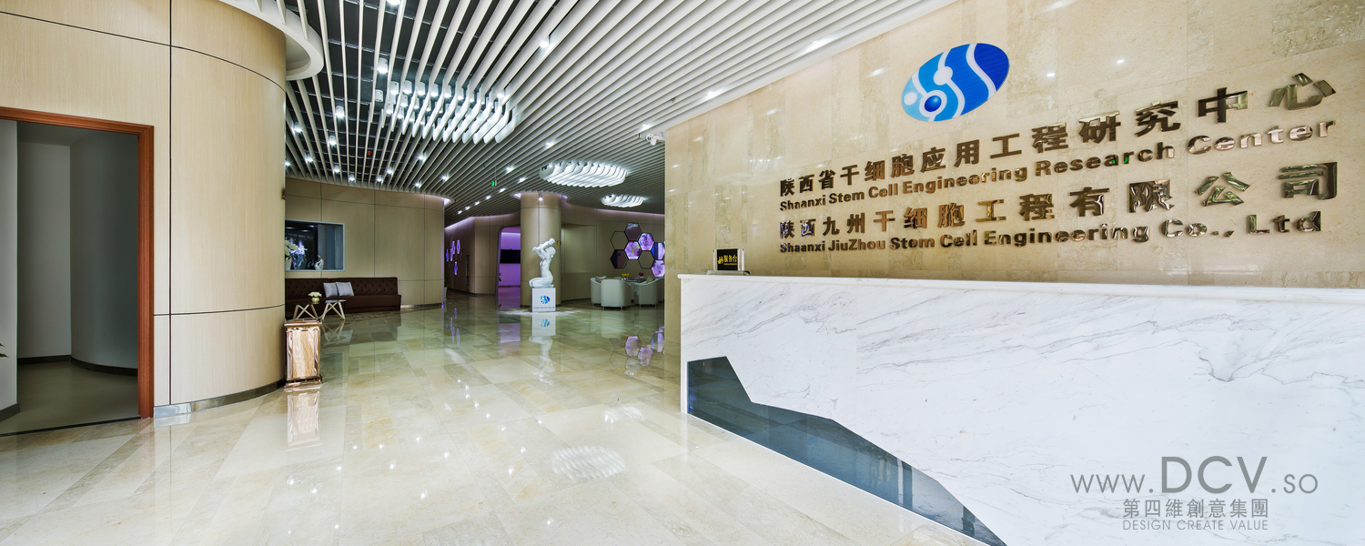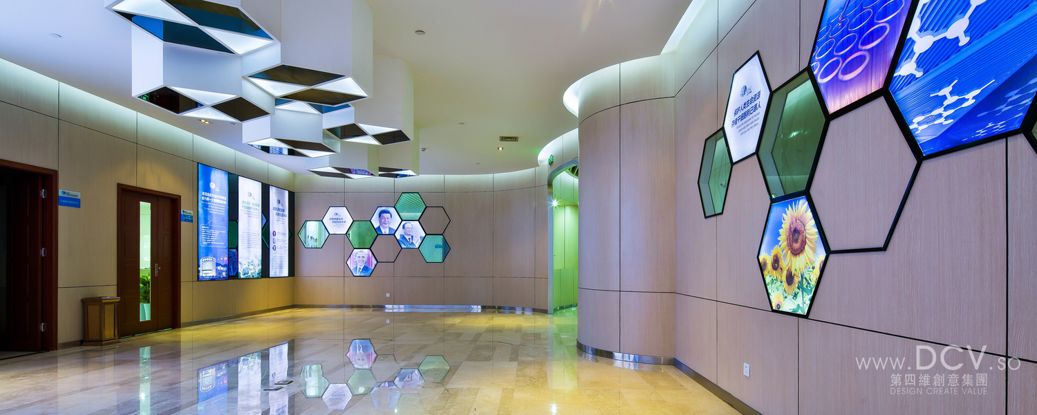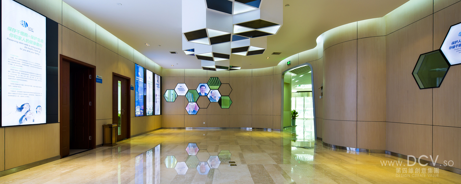 九州干细胞是一所以研制生物药业单位,所以在设计上,选用了细胞繁衍的元素,六边形相连接类似于细胞的造型,然后采用不同的形式表现,亚克力灯箱、防火板饰面、透明玻璃分别填充,这样既利用亚克力灯箱宣传本单位所研制的药业信息,也利用到透明玻璃给整个空间一个通透呼吸的感觉。