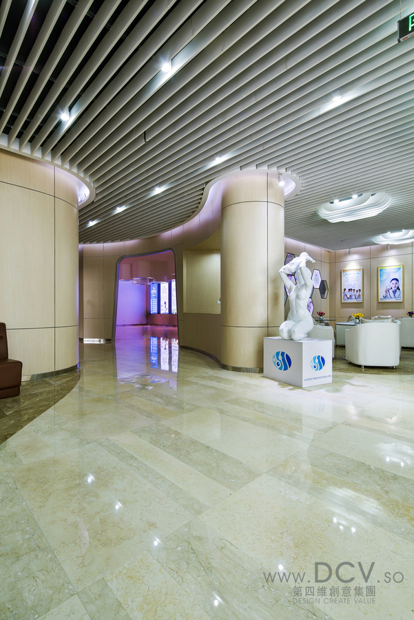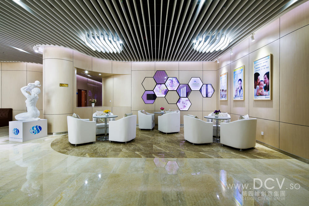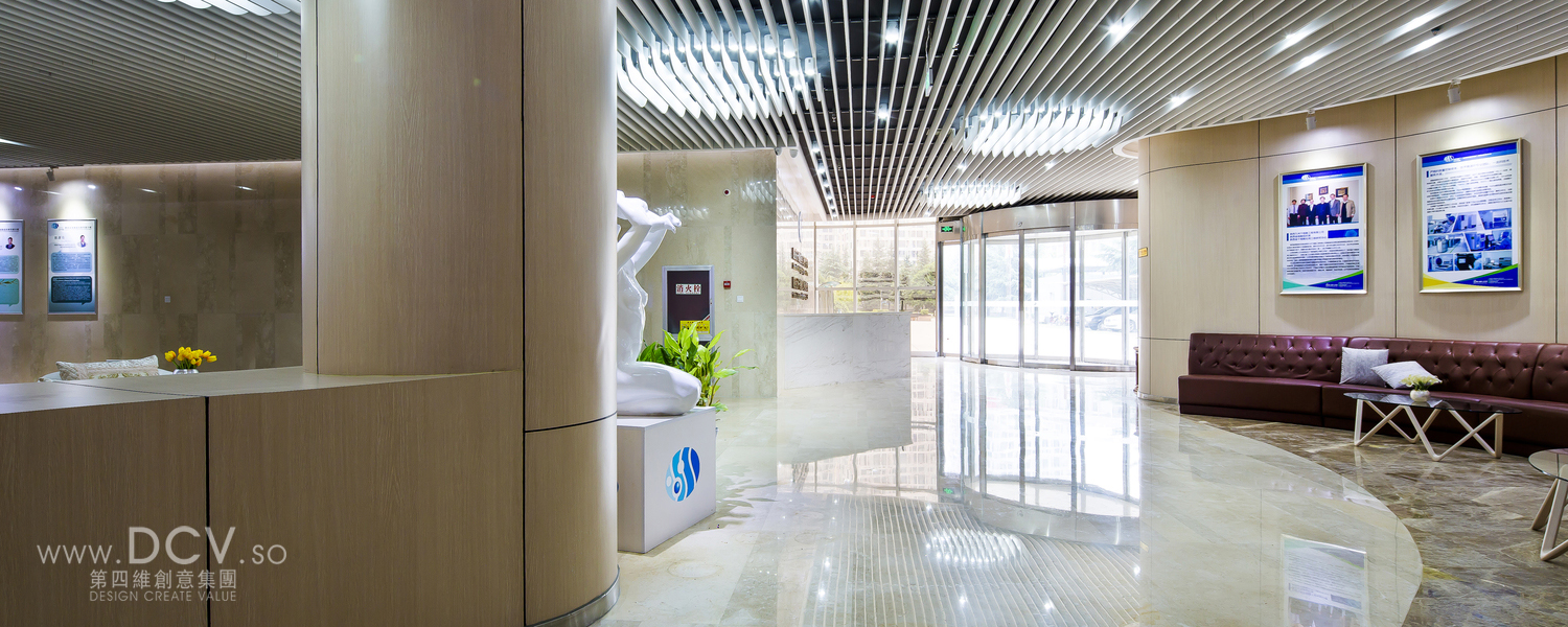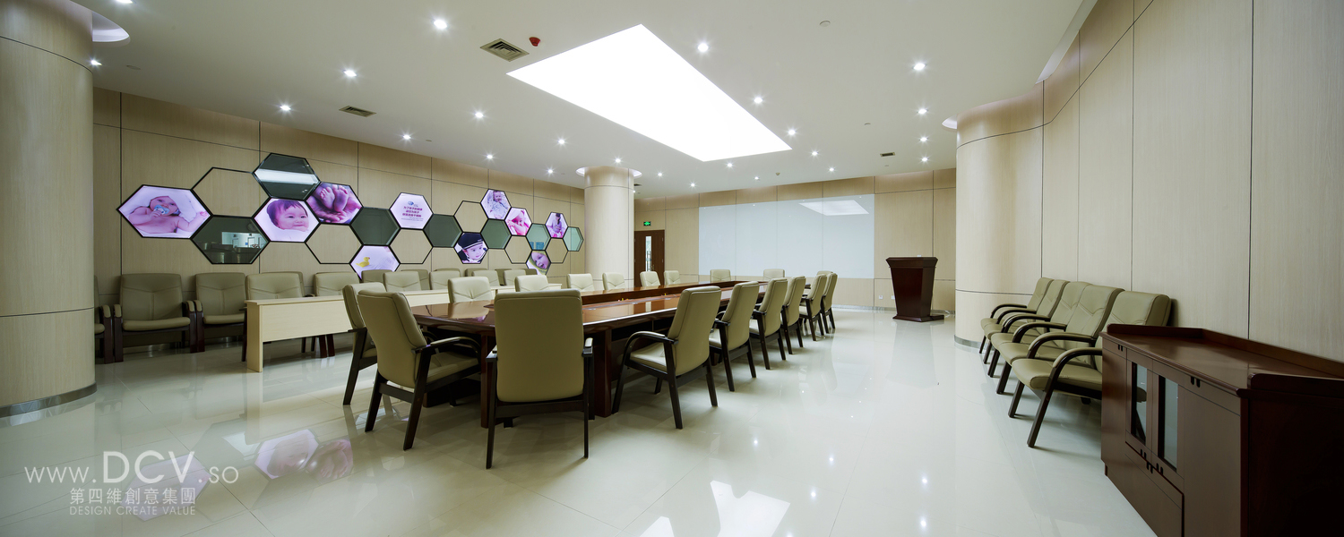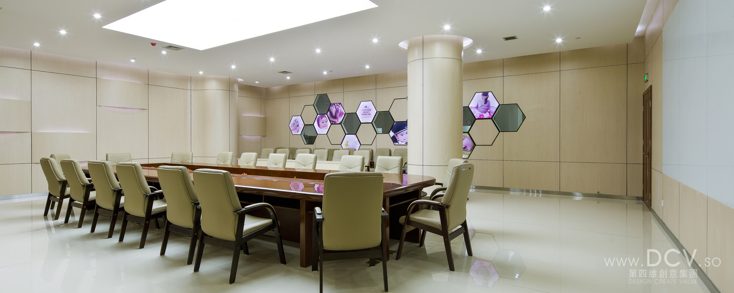 九州干细胞是一所以研制生物药业单位,所以在设计上,选用了细胞繁衍的元素,六边形相连接类似于细胞的造型,然后采用不同的形式表现,亚克力灯箱、防火板饰面、透明玻璃分别填充,这样既利用亚克力灯箱宣传本单位所研制的药业信息,也利用到透明玻璃给整个空间一个通透呼吸的感觉。