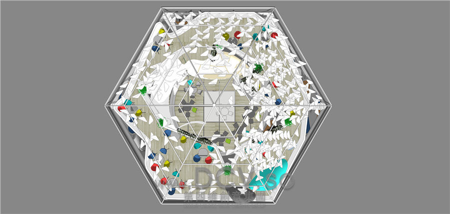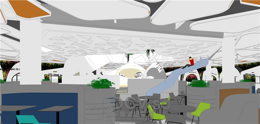 二层在利用原建筑结构的基础上我们搭建了挑空二层,打造出空间最具特色的空中生态餐厅,从一层到水吧区地台再进入拱形隧道楼梯至二层悬空生态餐厅,二层悬空生态餐厅主要以散座及舒适的桌椅布置展示餐厅的舒适感,在用完餐后可以经过金属滑滑梯体验在用餐之后的娱乐。